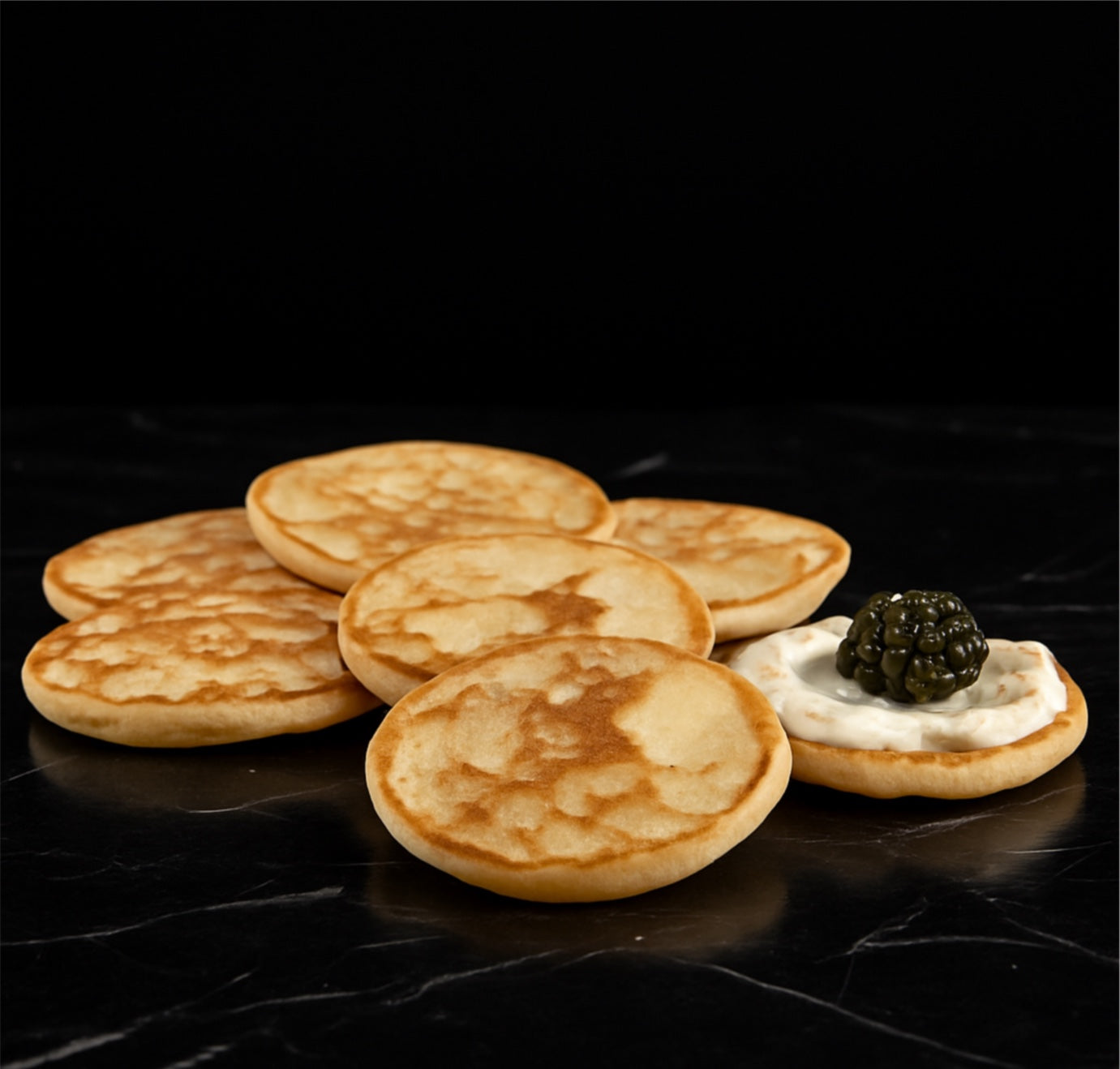 Descoperă rafinamentul gustului autentic cu aceste blinis artizanale, preparate manual după rețeta clasică rusească. Fine, pufoase și ușor aurii, aceste mini clătite din aluat fermentat sunt special concepute pentru a acompania caviarul, dar pot fi servite la fel de elegant cu somon afumat, smântână, pateuri fine sau mousse-uri gourmet.