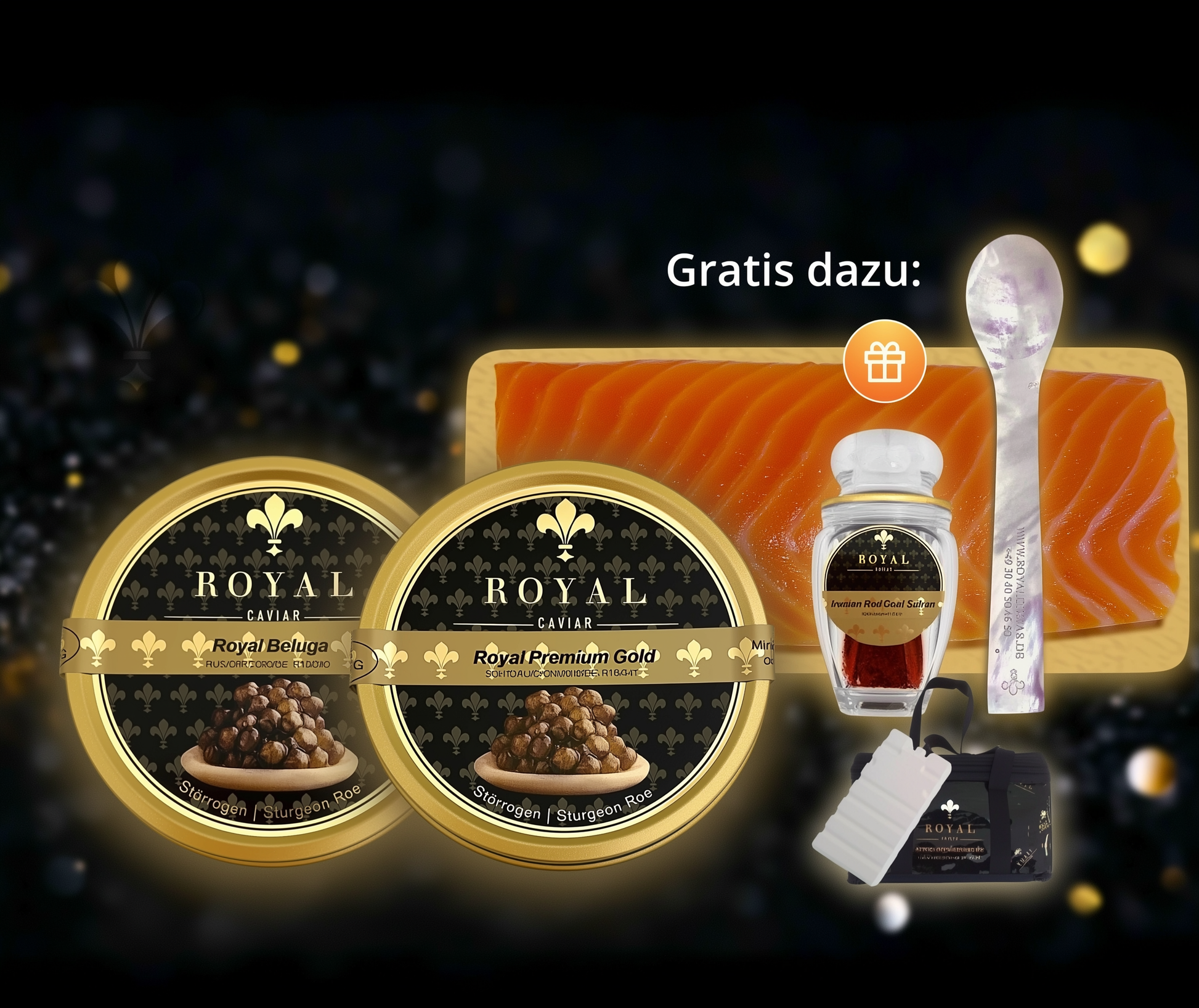 În plus, primiți cadou o jumătate de file de somon, o lingură elegantă din sidef și 1 gram de șofran de calitate superioară. Iar pentru păstrarea prospețimii, setul include o pungă de răcire Royal Caviar și un pachet de gheață – perfecte pentru a vă bucura de caviar în orice locație.