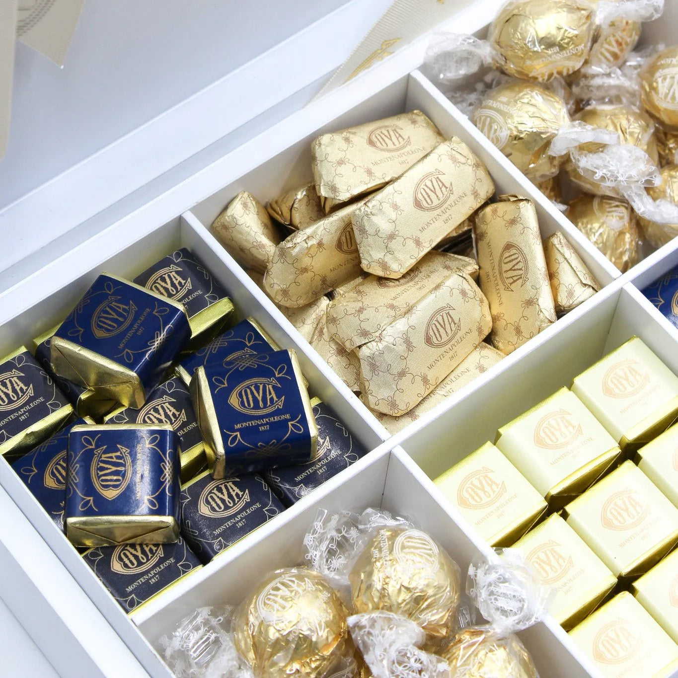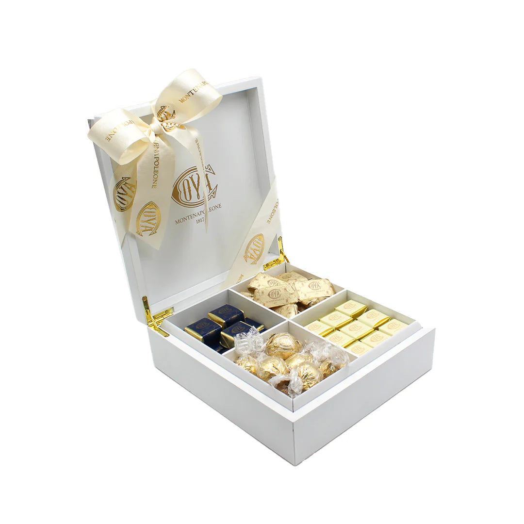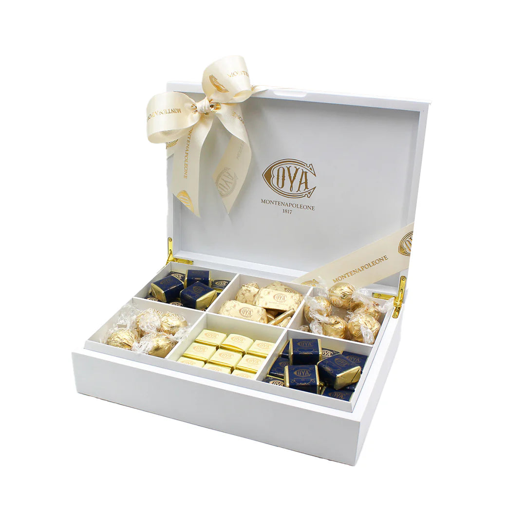 Un mod special de a prezenta un asortiment de ciocolățele ambalate individual: o degustare multisenzorială a celei mai bune tradiții a ciocolateriei italiene, prezentată „la vedere” și disponibilă în două formate elegante, cu patru sau șase compartimente